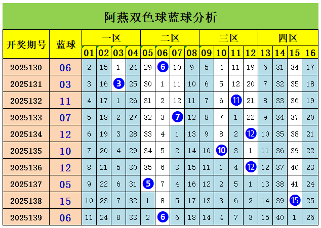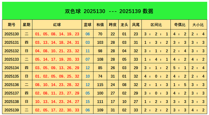 上期回顾:双色球第2025139期开出奖号:红球02、05、17、22、30、33;蓝球06,其中红球三区比为2:2:2,奇偶比3:3,大小比为4:2,蓝球开出0路号码06。